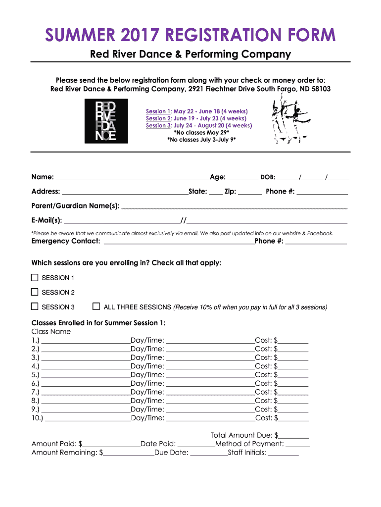 SUMMER 2017 REGISTRATION FORM Red River Dance & Performing Company Please send the below registration form along with your check or money order to: Red River Dance & Performing Company, 2921 Fighter