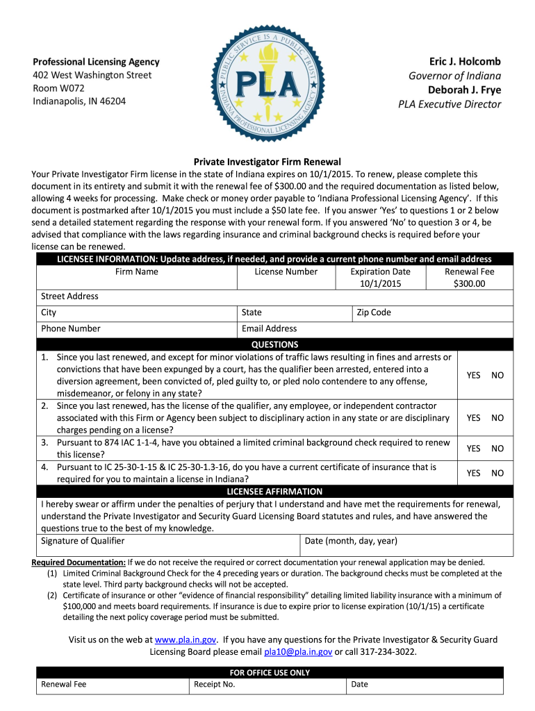 Your Private Investigator Firm license in the state of Indiana expires on 10/1/2015. To renew, please complete this