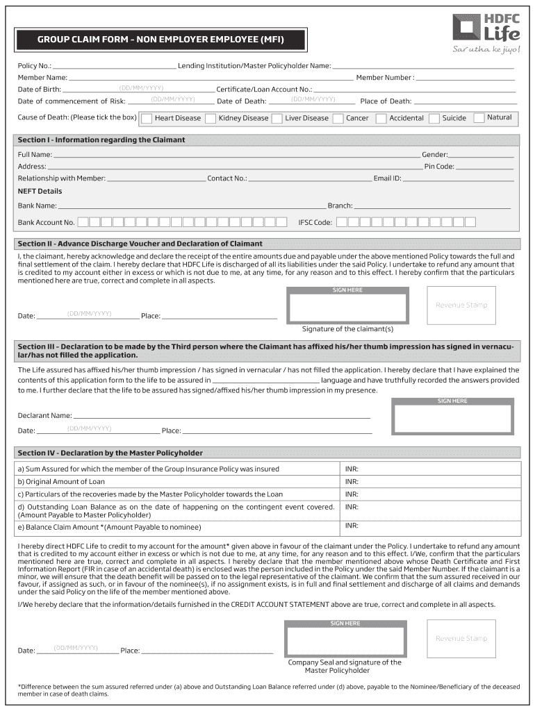 GROUP CLAIM FORM NON EMPLOYER EMPLOYEE (MFI) Policy No.: Lending Institution/Master Policyholder Name: Member Name: Member Number : (DD/MM/YYY) Date of Birth: Certificate/Loan Account No.: (DD/MM/YYY)