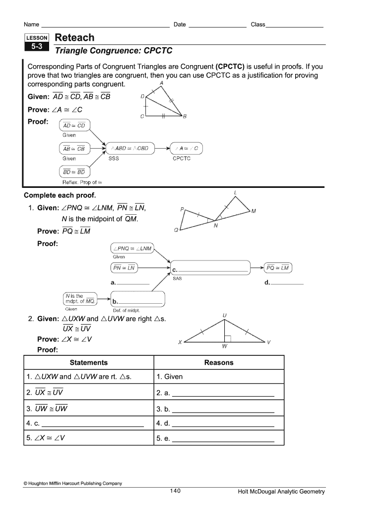 Name Date Class LESSON53Reteach Triangle Congruence: CPCTCCorresponding Parts of Congruent Triangles are Congruent (CPCTC) is useful in proofs. If you prove that two triangles are congruent, then
