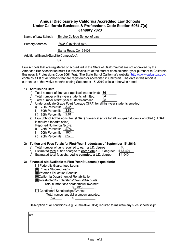 Annual Disclosure by California Accredited Law Schools Under California Business & Professions Code Section 6061.7(a) January 2020 Name of Law School:Empire College School of Primary Address:3035