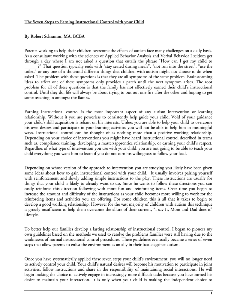 The Seven Steps to Earning Instructional Control with your Child By Robert Scram, MA, CBA Parents working to help their children overcome the effects of autism face many challenges on a daily basis.
