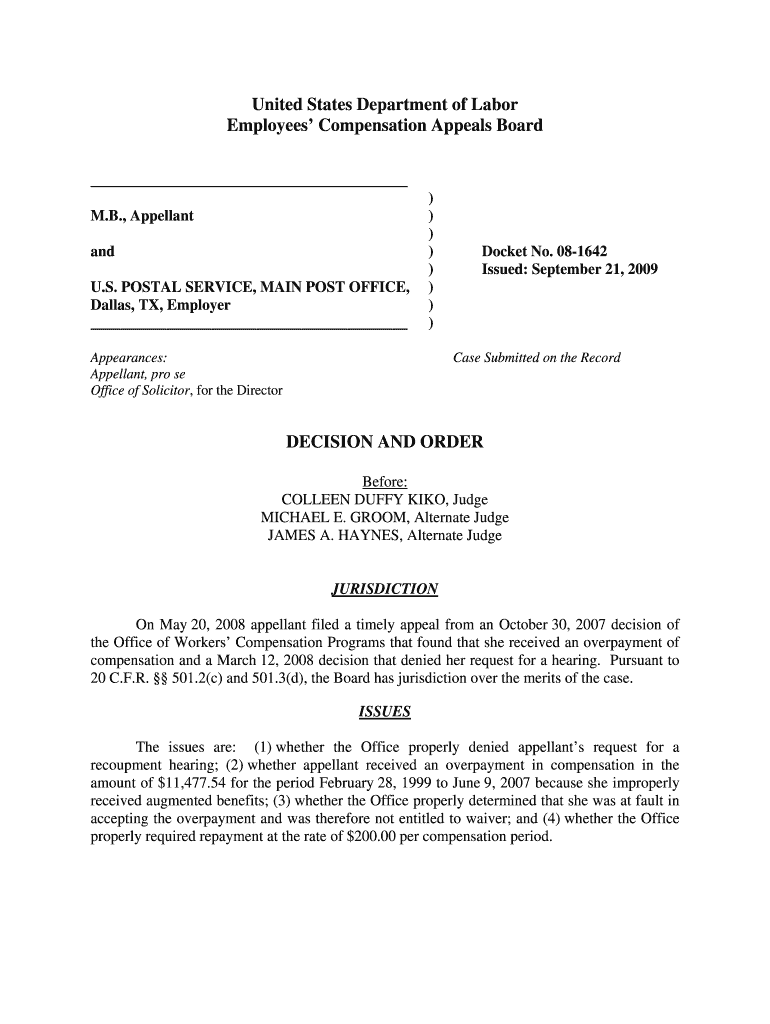 United States Department of Labor Employees Compensation Appeals Board M.B., Appellant and U.S. POSTAL SERVICE, MAIN POST OFFICE, Dallas, TX, Employer))))))))Appearances: Appellant, pro SE Office