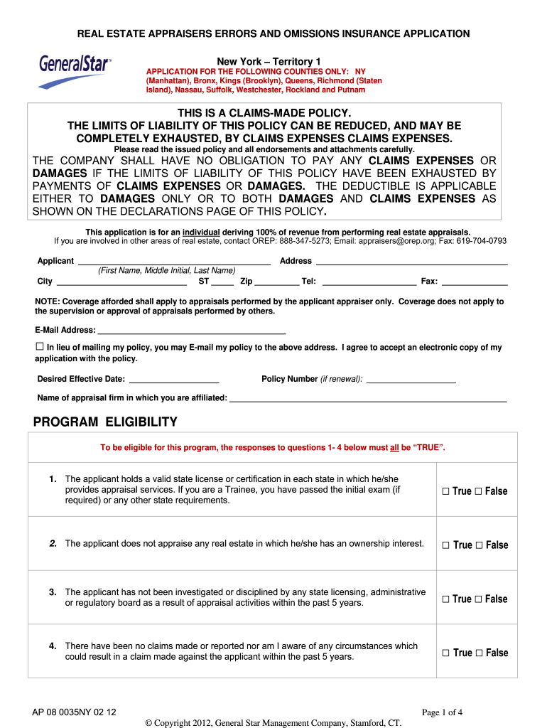 REAL ESTATE APPRAISERS ERRORS AND OMISSIONS INSURANCE APPLICATIONClear Form New York Territory 1 To Submit: Save then email to appraisers ores.org; Fax to 6197040567APPLICATION FOR THE FOLLOWING COUNTIES