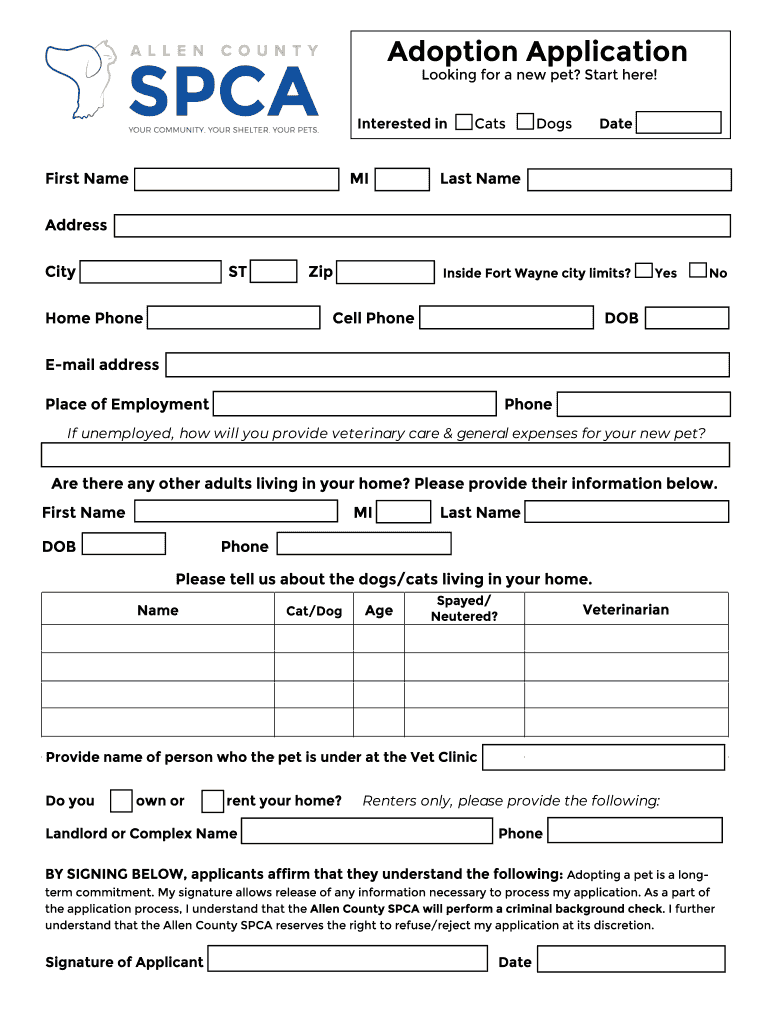 Adoption Application Looking for a new pet? Start here! Interested first NameMICatsDateDogsLast Headdress CitySTHome PhoneZipInside Fort Wayne city limits? Cell PhoneYesNoDOBEmail address Place of