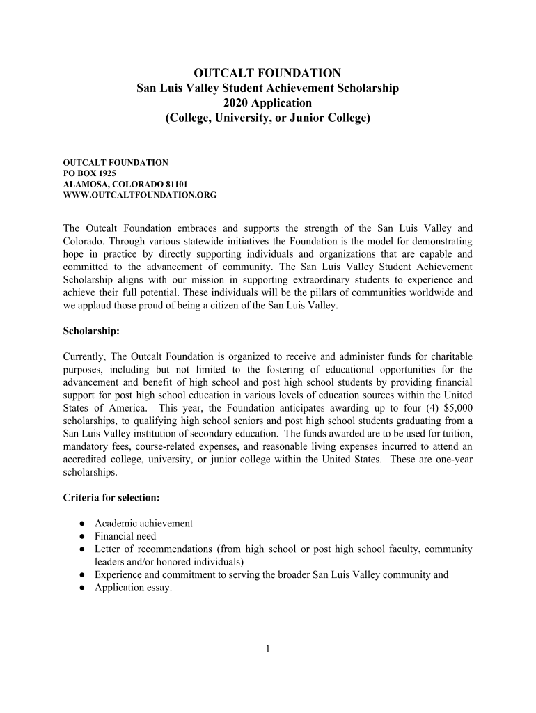 (College, University, or Junior College)OUTCAST FOUNDATION