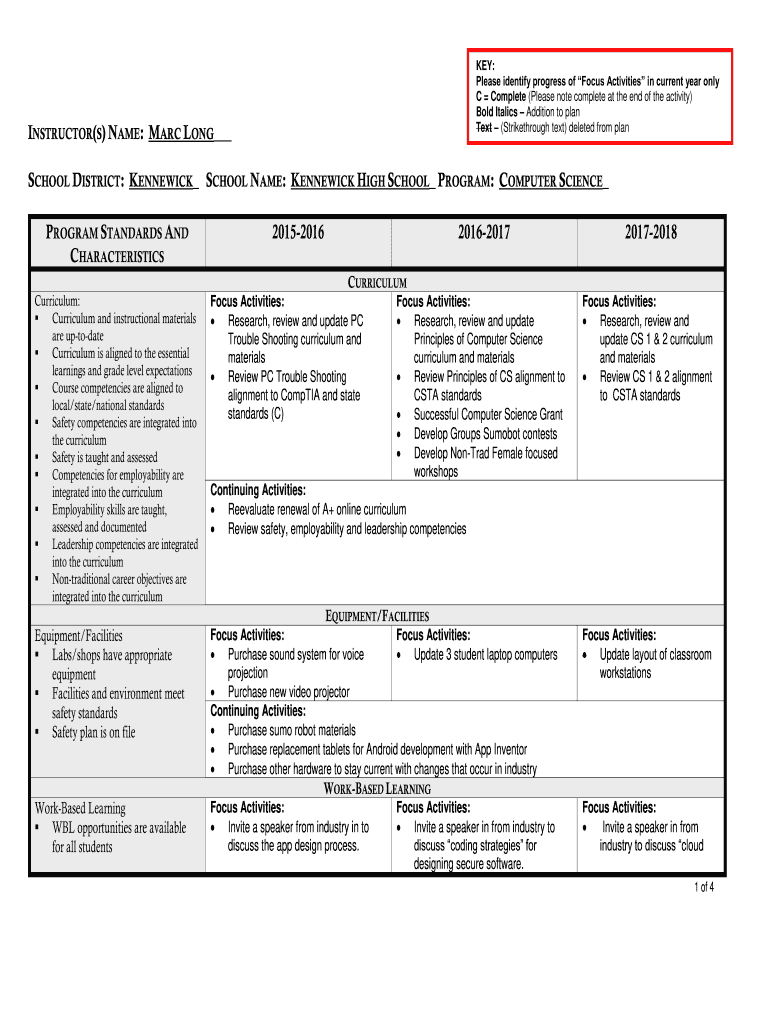 KEY: Please identify progress of Focus Activities in current year only C Complete (Please note complete at the end of the activity) Bold Italics Addition to plan Text (Strike through text) deleted