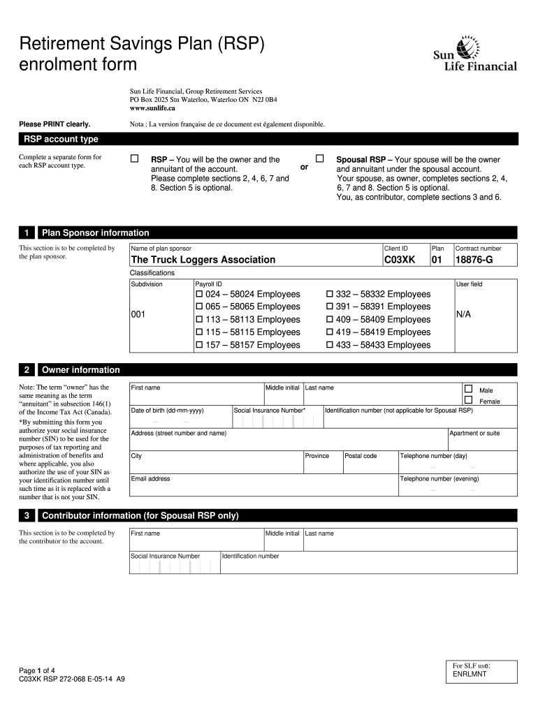 Retirement Savings Plan (RSP) enrollment form Sun Life Financial, Group Retirement Services PO Box 2025 STN Waterloo, Waterloo ON N2J 0B4 www.sunlife.ca Please PRINT clearly. Not : La version franchise