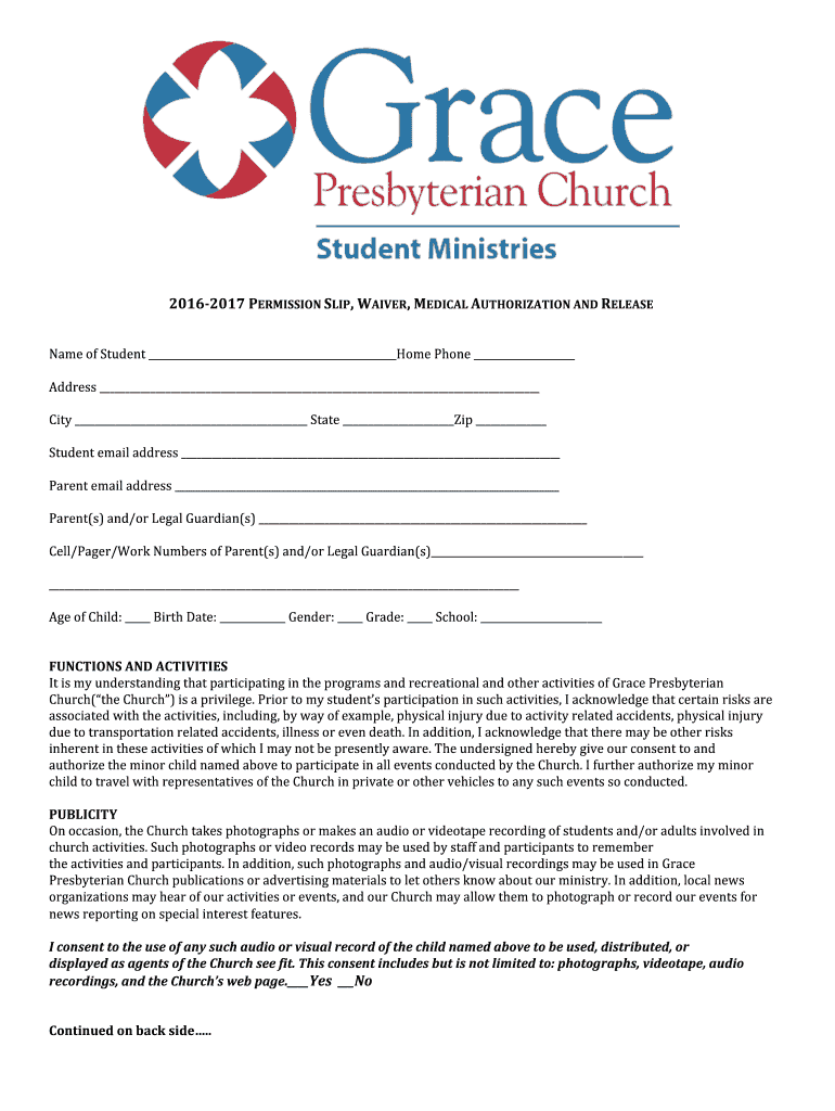 Get the free Name of Student Phone Addres - Grace Presbyterian Church