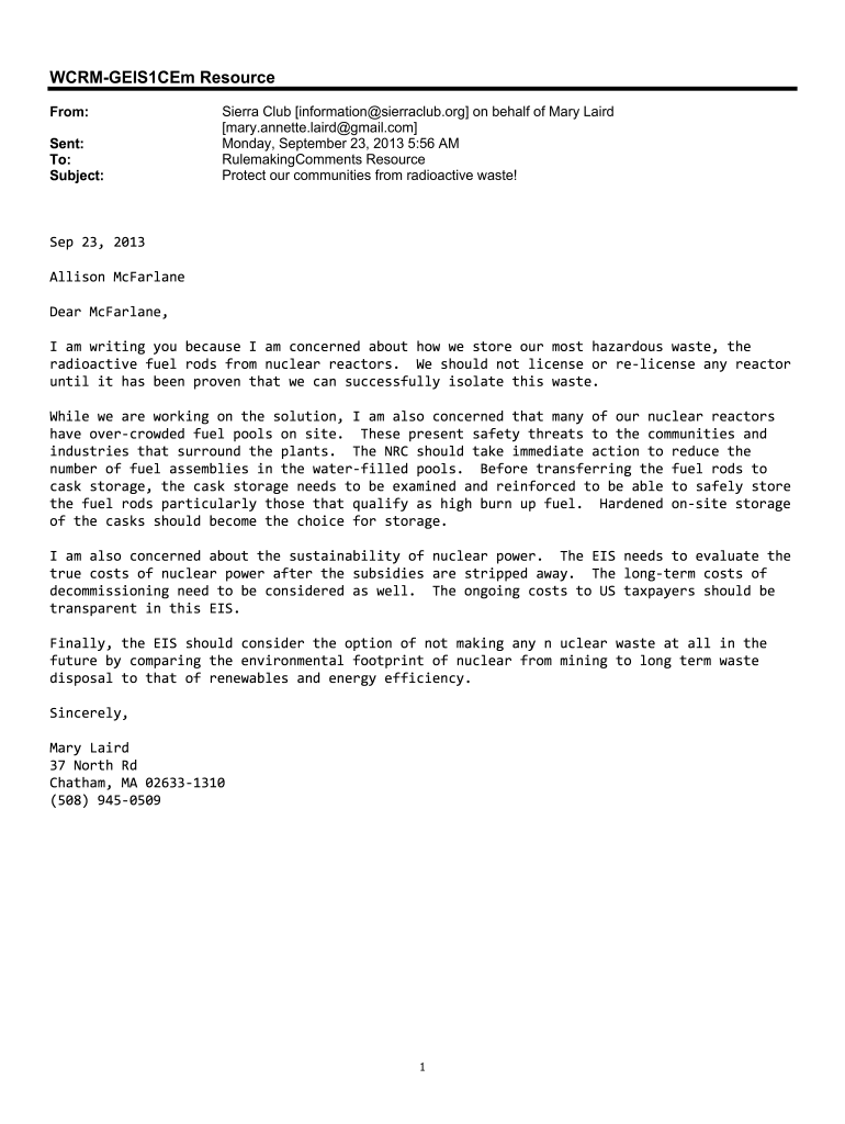WCRMGEIS1CEm Resource From: Sent: To: Subject:Sierra Club information sierra club.org on behalf of Mary Laird Mary. Annette.laird gmail.com Monday, September 23, 2013 5:56 AM RulemakingComments Resource