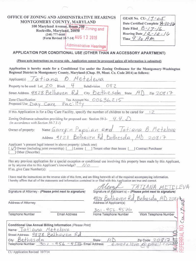 OFFICE OF ZONING AND ADMINISTRATIVE HEARINGS MONTGOMERY COUNTY, MARYLAND r;:i7r 100 Maryland Avenue, met Rockville, Marla d, 2(jg Zoning Andrea No. CU / Date Certified AUG 1 2 20169. TimeComplete817Date