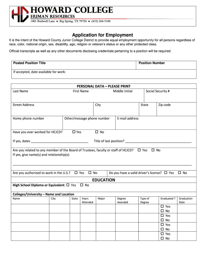 email: humanresources@howardcollege.eduPhone (432)2645100FEBRUARY 21, 2017Application for Employment
