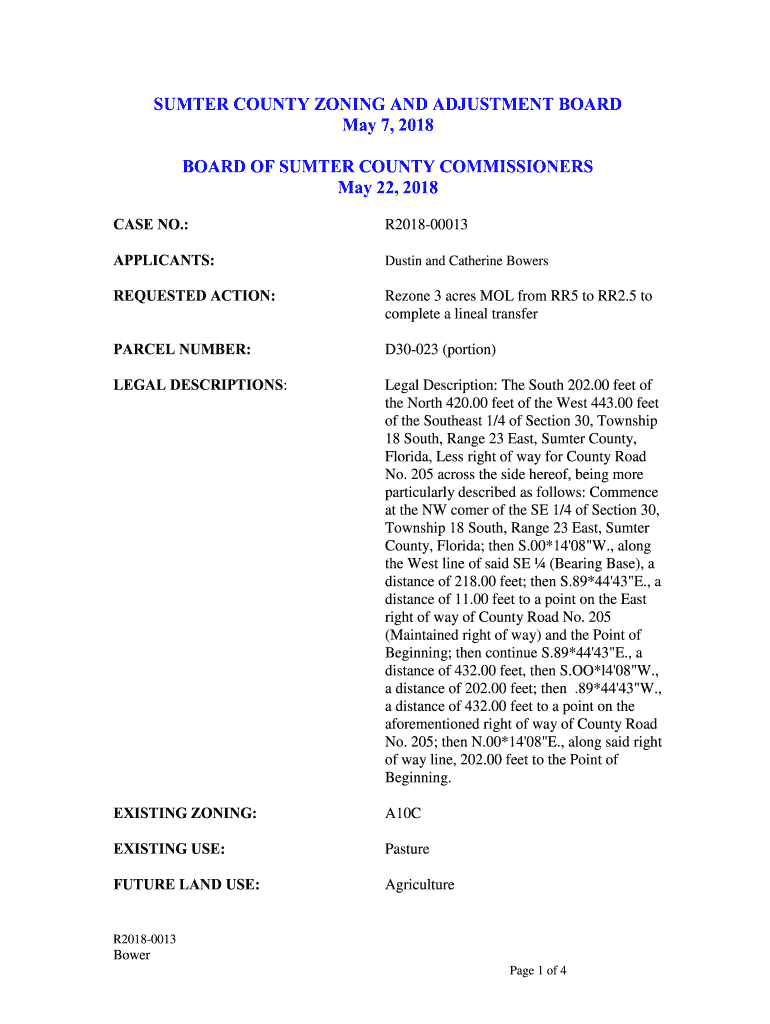 CASE NO.:R201800013APPLICANTS:Dustin and Catherine BowersREQUESTED ACTION:Rezone 3 acres MOL