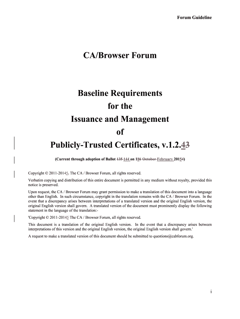 Forum Guideline CA/Browser ForumBaseline Requirements for the Issuance and Management of PubliclyTrusted Certificates, v.1.2.43 (Current through adoption of Ballot 135 144 on 186 October February