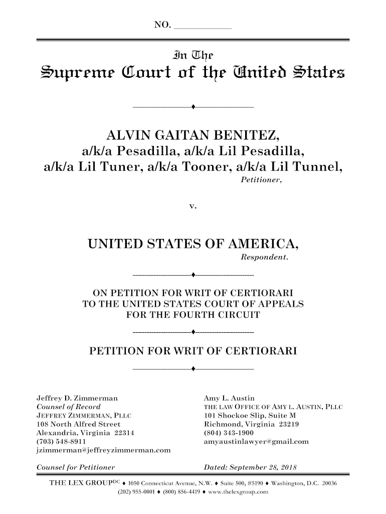 NO. In Supreme Court of the United States ALVIN GAIMAN BENITEZ, a/k/a Padilla, a/k/a Little Padilla, a/k/a Little Tuner, a/k/a Sooner, a/k/a Little Tunnel, Petitioner, v.UNITED STATES OF AMERICA,