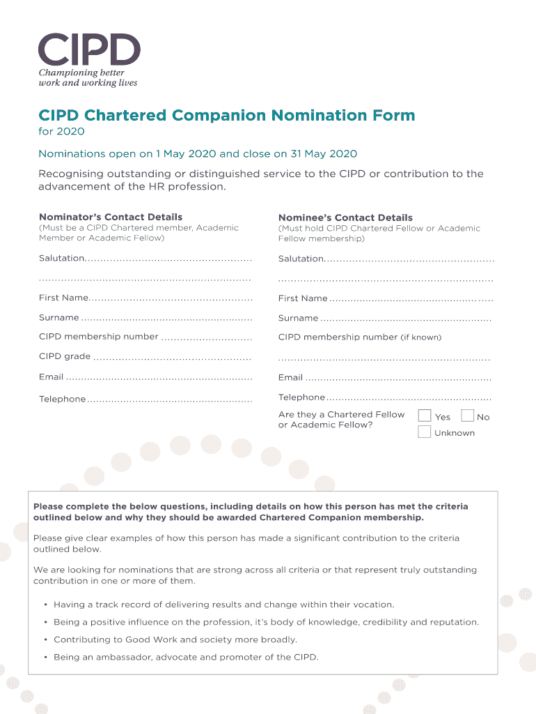 CIPD Chartered Companion Nomination Form for 2020Nominations open on 1 May 2020 and close on 31 May 2020 Recognizing outstanding or distinguished service to the CIPD or contribution to the advancement