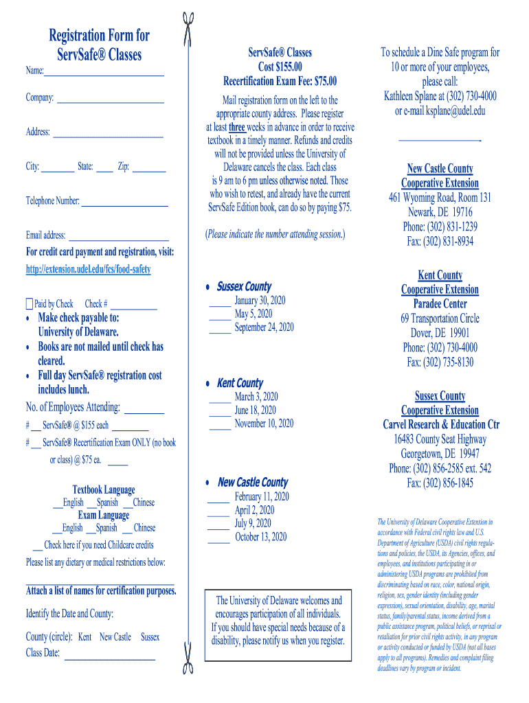 Registration Form for Service ClassesServSafe Classes Cost $155.00 Recertification Exam Fee: $75.00Name: Company: Address: City: State: Zip: Telephone Number: Email address: Mail registration form