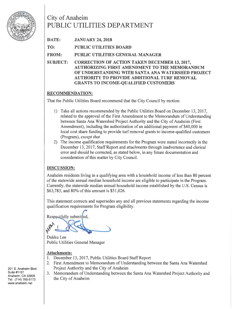 City of AnaheimPUBLIC UTILITIES DEPARTMENT DATE:DECEMBER 13, 2017TO:PUBLIC UTILITIES BOARDROOM:PUBLIC UTILITIES GENERAL MANAGERSUBJECT:FIRST AMENDMENT TO THE MEMORANDUM OF UNDERSTANDING WITH SANTA