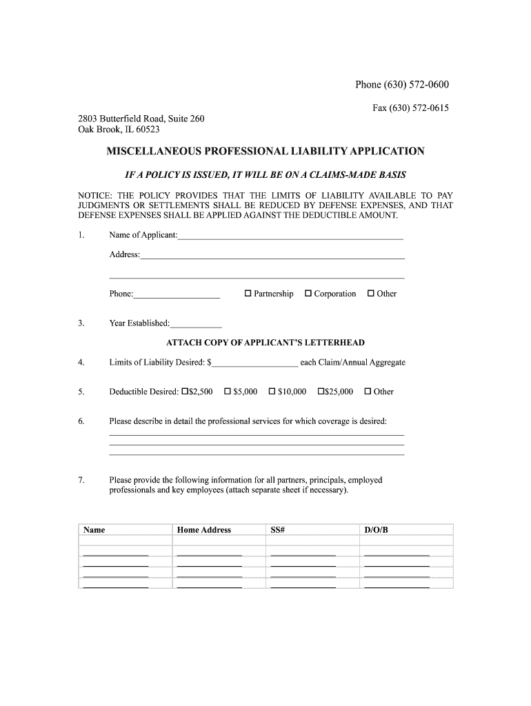 Phone (630) 5720600 Fax (630) 57206152803 Butterfield Road, Suite 260 Oak Brook, IL 60523MISCELLANEOUS PROFESSIONAL LIABILITY APPLICATION IF A POLICY IS ISSUED, IT WILL BE ON A CLASSMATE BASIS NOTICE: