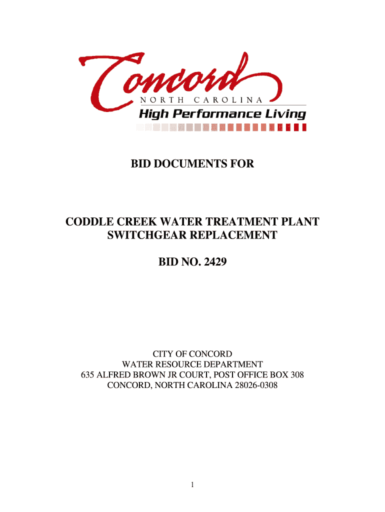 BID DOCUMENTS FORCIBLE CREEK WATER TREATMENT PLANT SWITCHGEAR REPLACEMENT BID NO. 2429CITY OF CONCORD WATER RESOURCE DEPARTMENT 635 ALFRED BROWN JR COURT, POST OFFICE BOX 308 CONCORD, NORTH CAROLINA