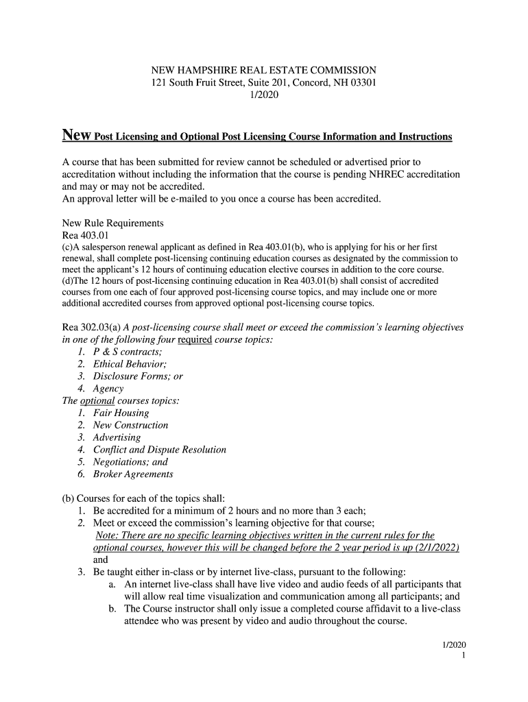 1/2020New Post Licensing and Optional Post Licensing Course Information and Instructions
