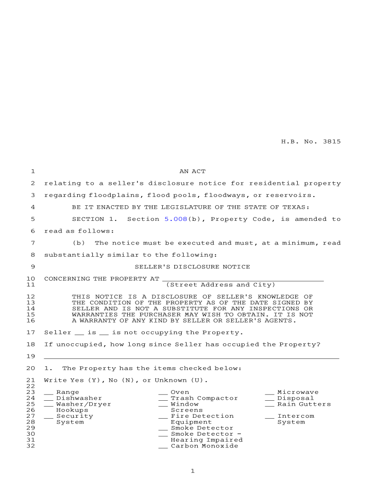 H.B.ANO. A38151AN ACT2relating to a seller s disclosure notice for residential property3regarding floodplains, flood pools, flood ways, or reservoirs.4BE IT ENACTED BY THE LEGISLATURE OF THE STATE
