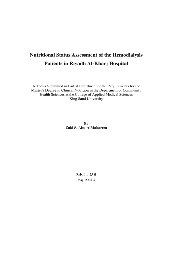 Nutritional Status Assessment of the Hemodialysis Patients in Riyadh Elkhart Hospital A Thesis Submitted in Partial Fulfillment of the Requirements for the Master's Degree in Clinical Nutrition in