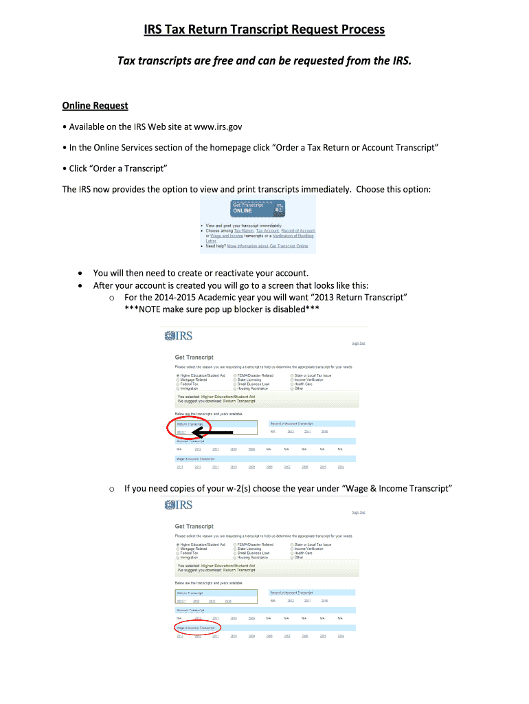 You can request your IRS Tax Return Transcript online, by mail, or by phone. Each method has specific instructions which you can find in the IRS Tax Return Transcript Request guide.