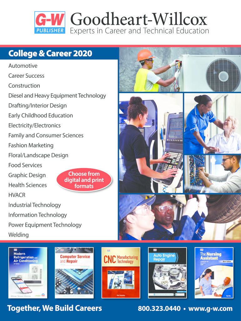 This document serves as a catalog for Goodheart-Willcox educational products, detailing various career and technical education options across multiple fields including automotive, construction, welding,