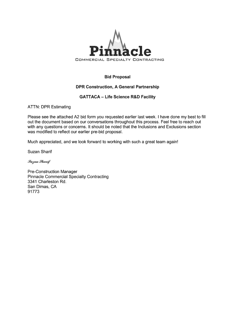 Bid Proposal DR Construction, A General Partnership GATT ACA Life Science R&D Facility ATTN: DR Estimating Please see the attached A2 bid form you requested earlier last week. I have done my best