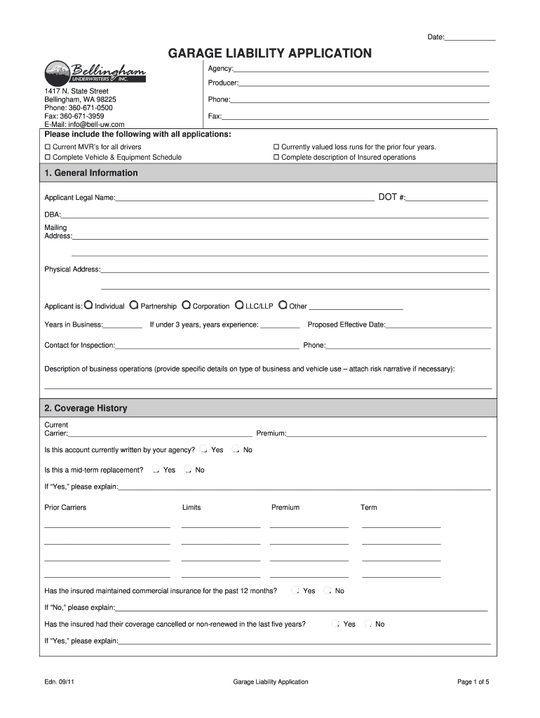 Date: GARAGE LIABILITY APPLICATION Agency: Producer: 1417 N. State Street Bellingham, WA 98225 Phone: 3606710500 Fax: 3606713959 Email: info belluw.com Phone: Fax: Please include the following with