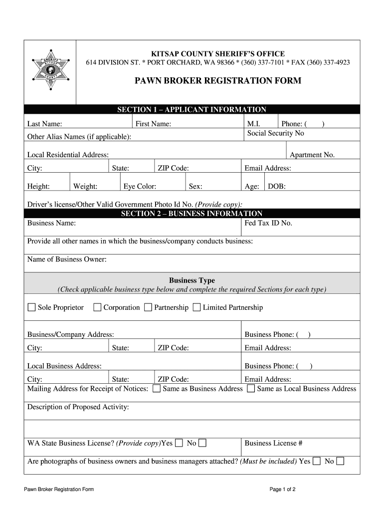 KITSAP COUNTY SHERIFFS OFFICE 614 DIVISION ST. * PORT ORCHARD, WA 98366 * (360) 3377101 * FAX (360) 3374923PAWN BROKER REGISTRATION FORM SECTION 1 APPLICANT INFORMATION Last Name:First Name:M.I. Phone: