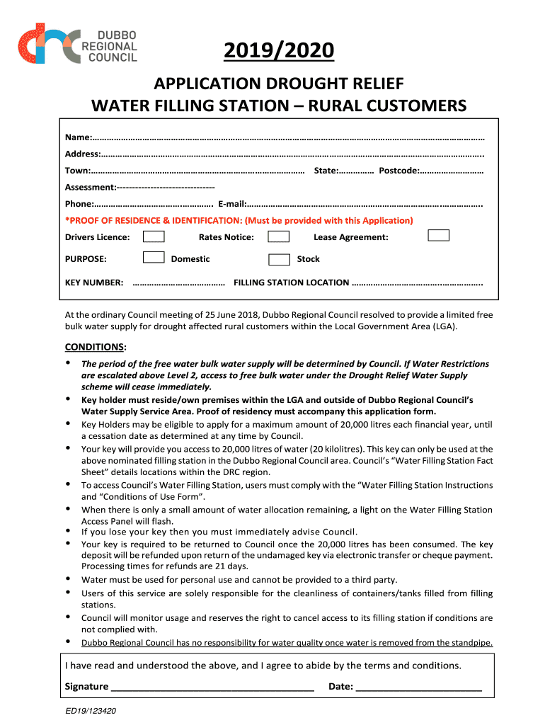 2019/2020 APPLICATION DROUGHT RELIEF WATER FILLING STATION RURAL CUSTOMERS Name: Address:. Town: