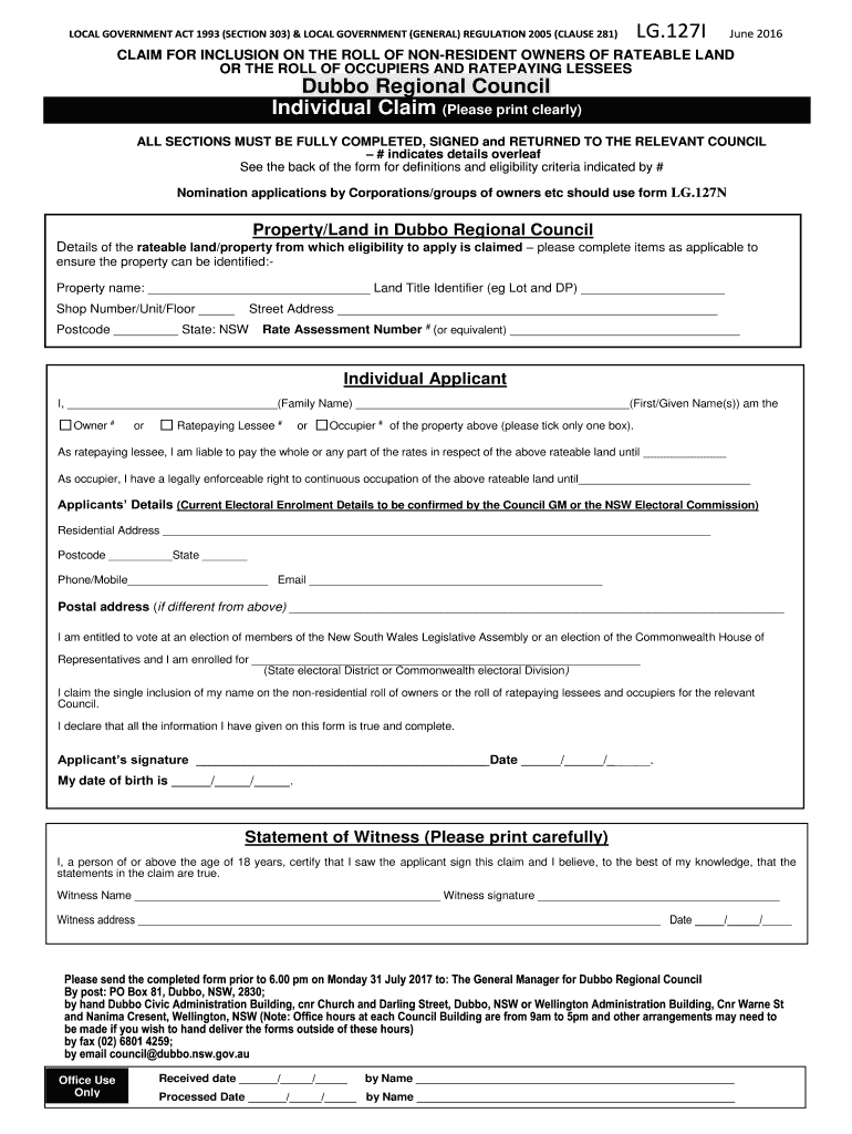 LOCAL GOVERNMENT ACT 1993 (SECTION 303) & LOCAL GOVERNMENT (GENERAL) REGULATION 2005 (CLAUSE 281)LG.127IJune 2016CLAIM FOR INCLUSION ON THE ROLL OF NONRESIDENT OWNERS OF HATEABLE LAND OR THE ROLL
