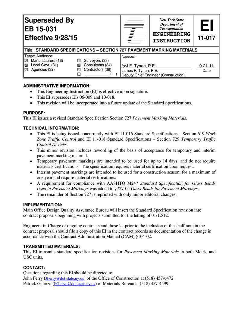 Superseded By EX 15031 Effective 9/28/15New York State Department of TransportationEIENGINEERING INSTRUCTION11017Title: STANDARD SPECIFICATIONS SECTION 727 PAVEMENT MARKING MATERIALS Target Audience: