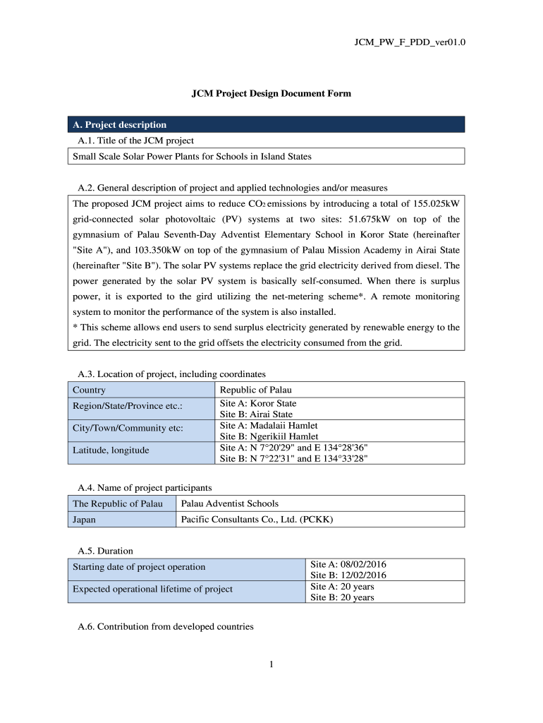 CM PW F PDD ver01.0JCM Project Design Document Form A. Project description A.1. Title of the CM project Small Scale Solar Power Plants for Schools in Island States A.2. General description of project