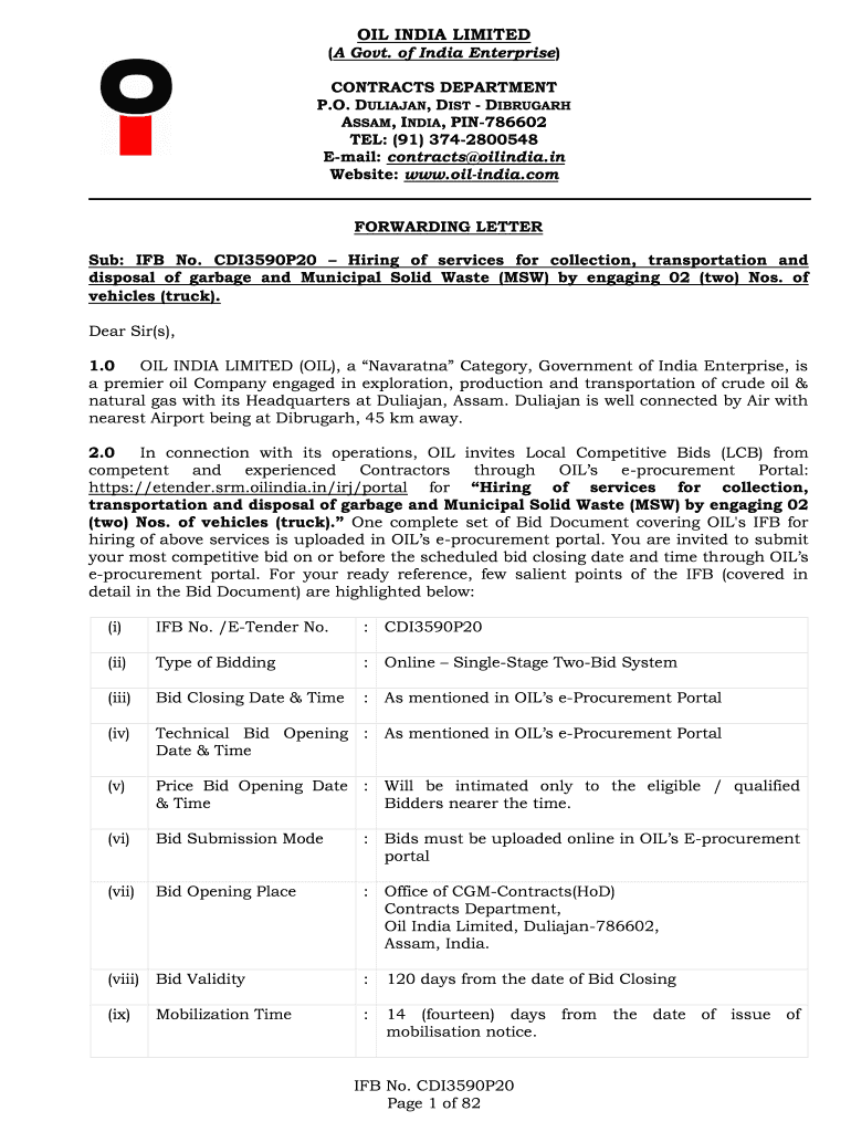 OIL INDIA LIMITED (A Govt. of India Enterprise) CONTRACTS DEPARTMENT P.O. CULIACÁN, DIST DISREGARD ASSAM, INDIA, PIN786602 TEL: (91) 3742800548 Email: contracts India.in Website: www.oilindia.com