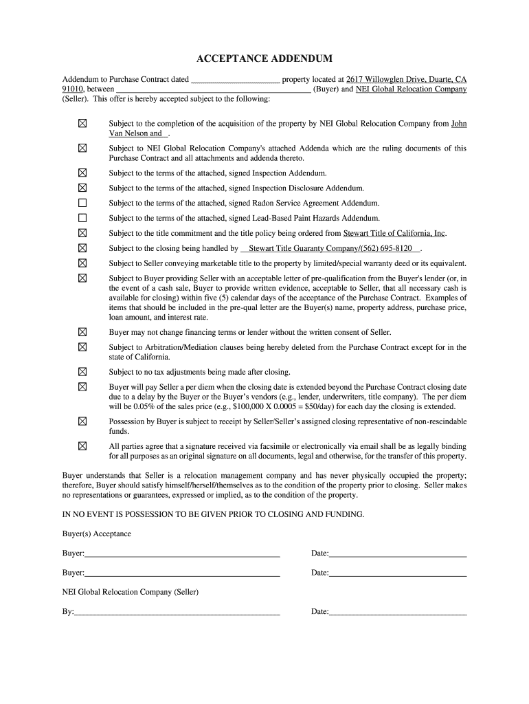 (Seller). This offer is hereby accepted subject to the following:property located at 2617 Willow glen Drive, Duarte, CA