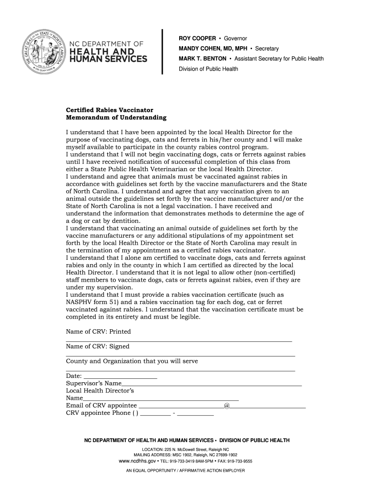 ROY COOPER Governor MANDY COHEN, MD, MPH Secretary MARK T. BENTON Assistant Secretary for Public Health Division of Public HealthCertified Rabies Vaccination Memorandum of Understanding I understand