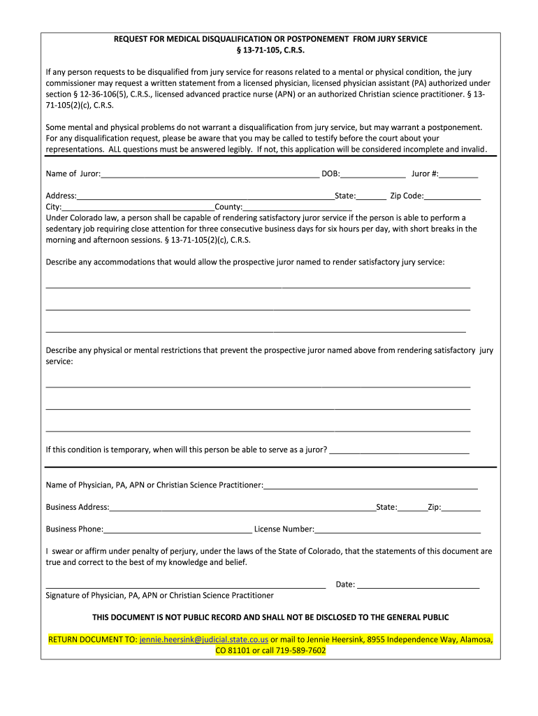 REQUEST FOR MEDICAL DISQUALIFICATION OR POSTPONEMENT FROM JURY SERVICE 1371105, C.R.S. If any person requests to be disqualified from jury service for reasons related to a mental or physical condition,