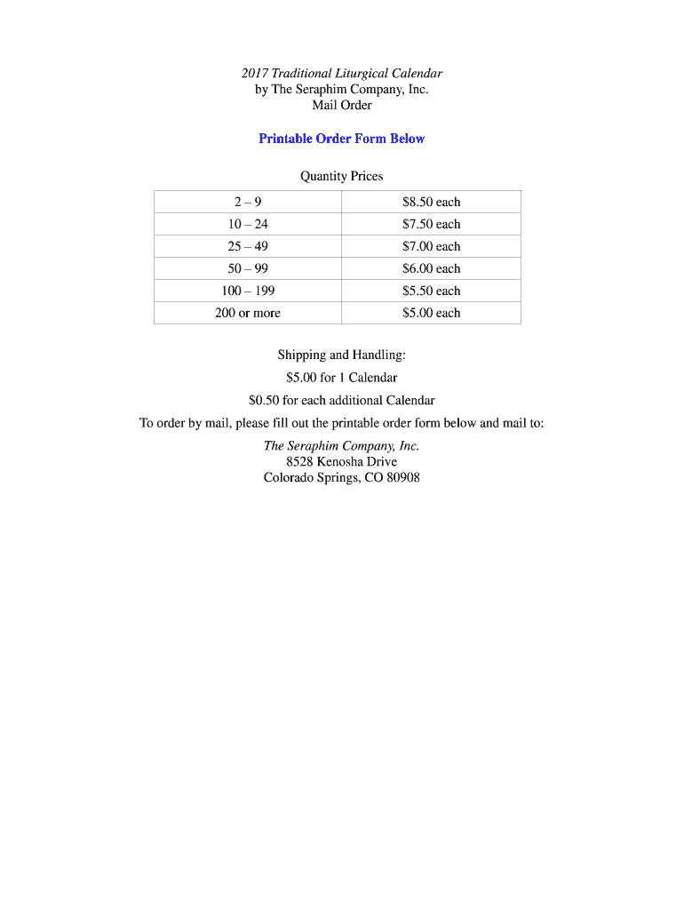 2017 Traditional Liturgical Calendar by The Seraphic Company, Inc. Mail Order Printable Order Form Below Quantity Prices $298.50 each$10247.50 each$25497.00 each$50996.00 each$1001995.50 each200 or