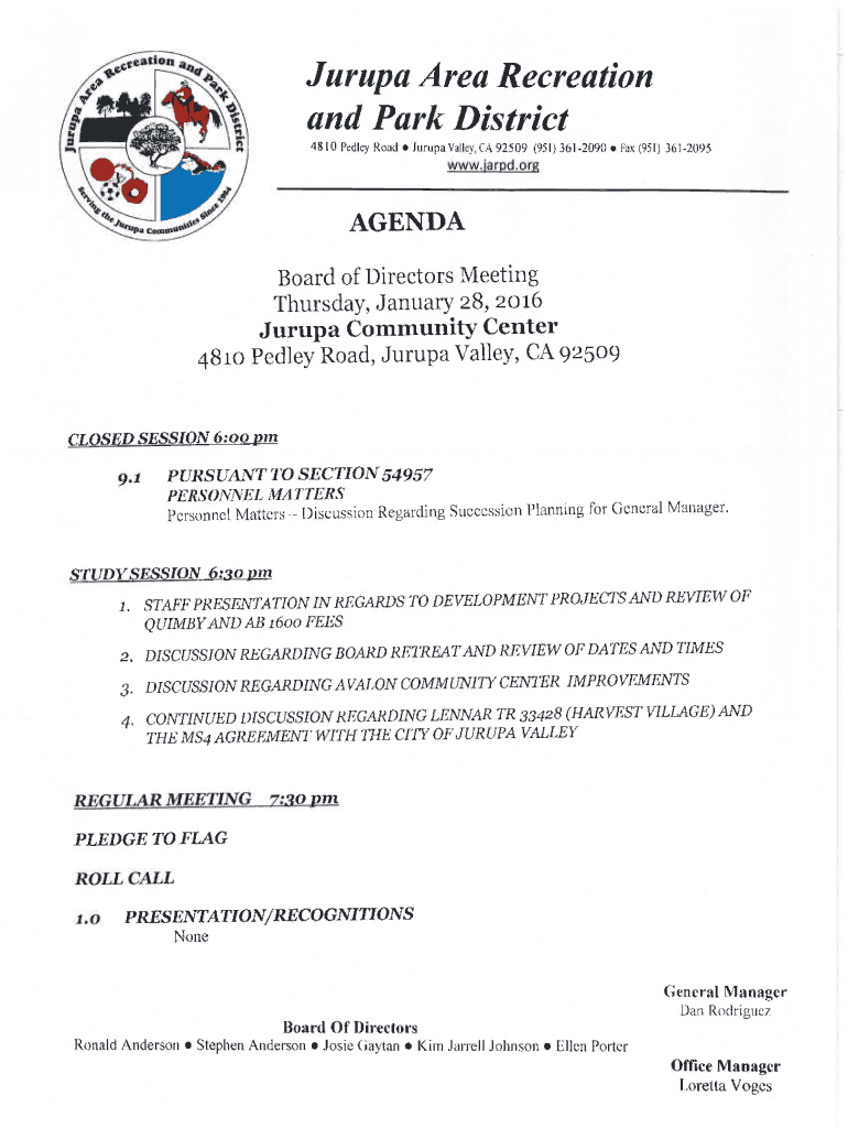 Jurupa Area Recreation and Park District 48l0 PedlcyRoadIJurupa Va CY, CA 92509 (95) 3612090IFax 9S) 36!2095www argdmgBoard of Directors Meeting Thursday, January 28, 2016, Jurupa Community Center