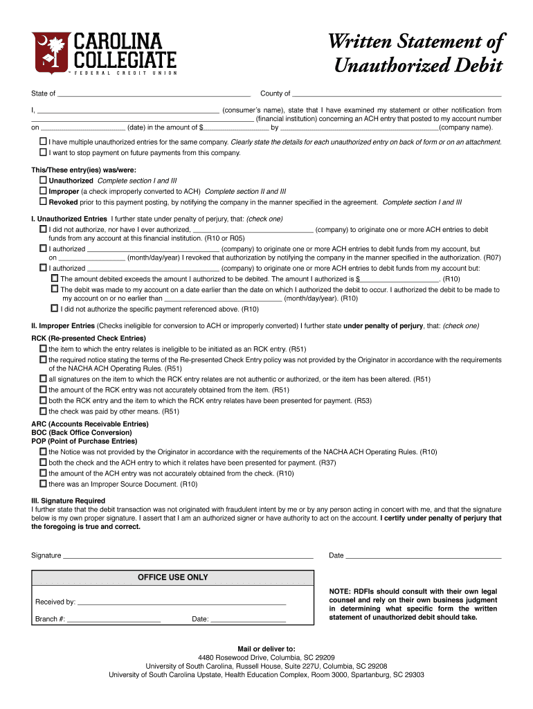 The Unauthorized Debit Statement Form is a personal affidavit used by consumers to report unauthorized or improper ACH debits from their financial accounts.