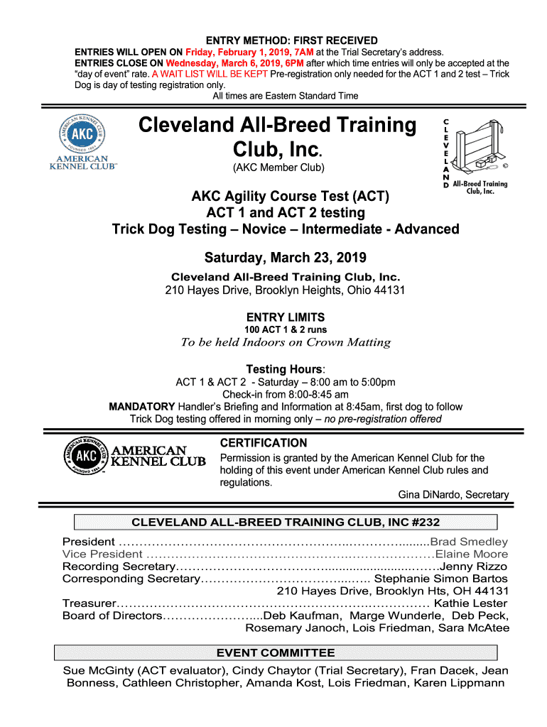 ENTRY METHOD: FIRST RECEIVEDENTRIES WILL OPEN ON Friday, February 1, 2019, 7AM at the Trial Secretary's address. ENTRIES CLOSE ON Wednesday, March 6, 2019, 6PM after which time entries will only be