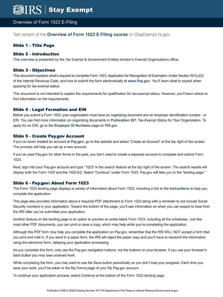 Stay Exempt Overview of Form 1023 Filing Text version of the Overview of Form 1023 Filing course on Tax-exempt.IRS.gov Slide 1 Title Page Slide 2 Introduction This overview is presented by the Tax