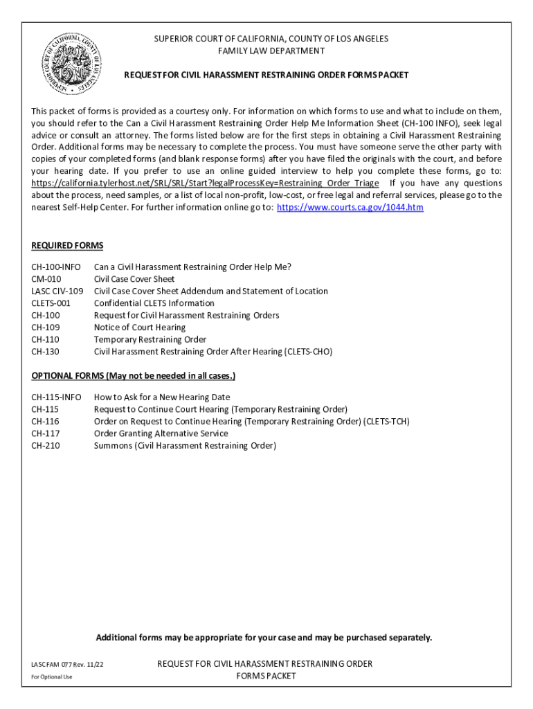 SUPERIOR COURT OF CALIFORNIA, COUNTY OF LOS ANGELES FAMILY LAW DEPARTMENT REQUEST FOR CIVIL HARASSMENT RESTRAINING ORDER FORMS PACKET This packet of forms is provided as a courtesy only. For advice