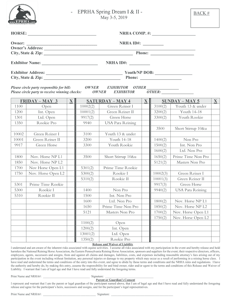 EPR HA Spring Dream I & II BACK #May 35, 2019, HORSE: NRA COMP. #: Owner: NRH AID#: Owners Address: City, State & Zip: Phone: Exhibitor Name: NRH AID#: Exhibitor Address: Youth/NP DOB: City, State