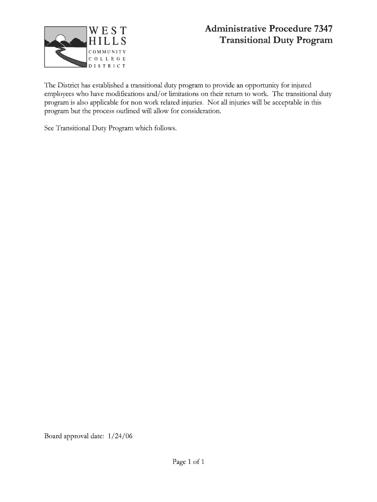 Administrative Procedure 7347 Transitional Duty Program The District has established a transitional duty program to provide an opportunity for injured employees who have modifications and/or limitations