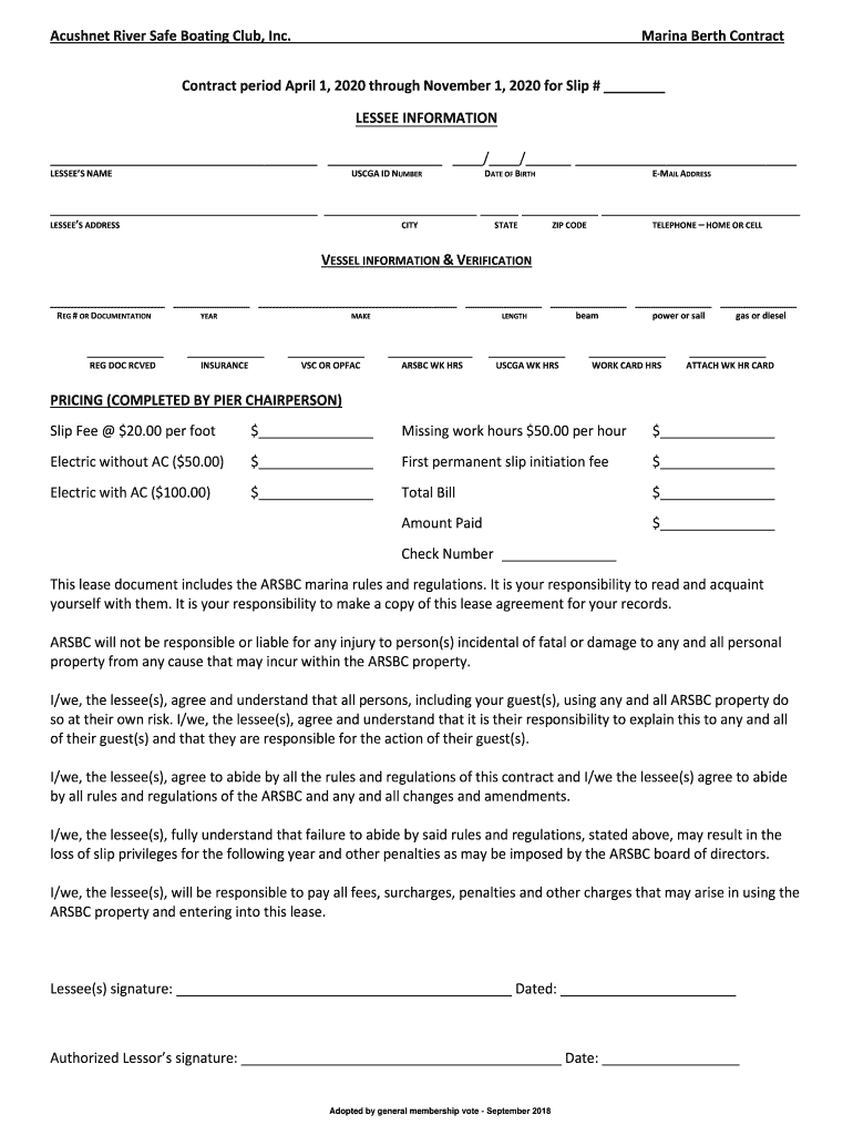 Usenet River Safe Boating Club, Inc. Marina Berth ContractContract period April 1, 2020, through November 1, 2020, for Slip # LESSEE INFORMATION / / LESSEES NAMEUSCGA ID NUMERATE OF BIRTHMARK ADDRESS