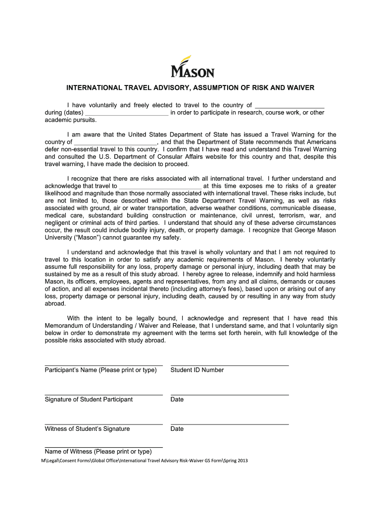 Get the free International Travel Advisory Risk-Waiver GS Form For University-Wide Use.docx